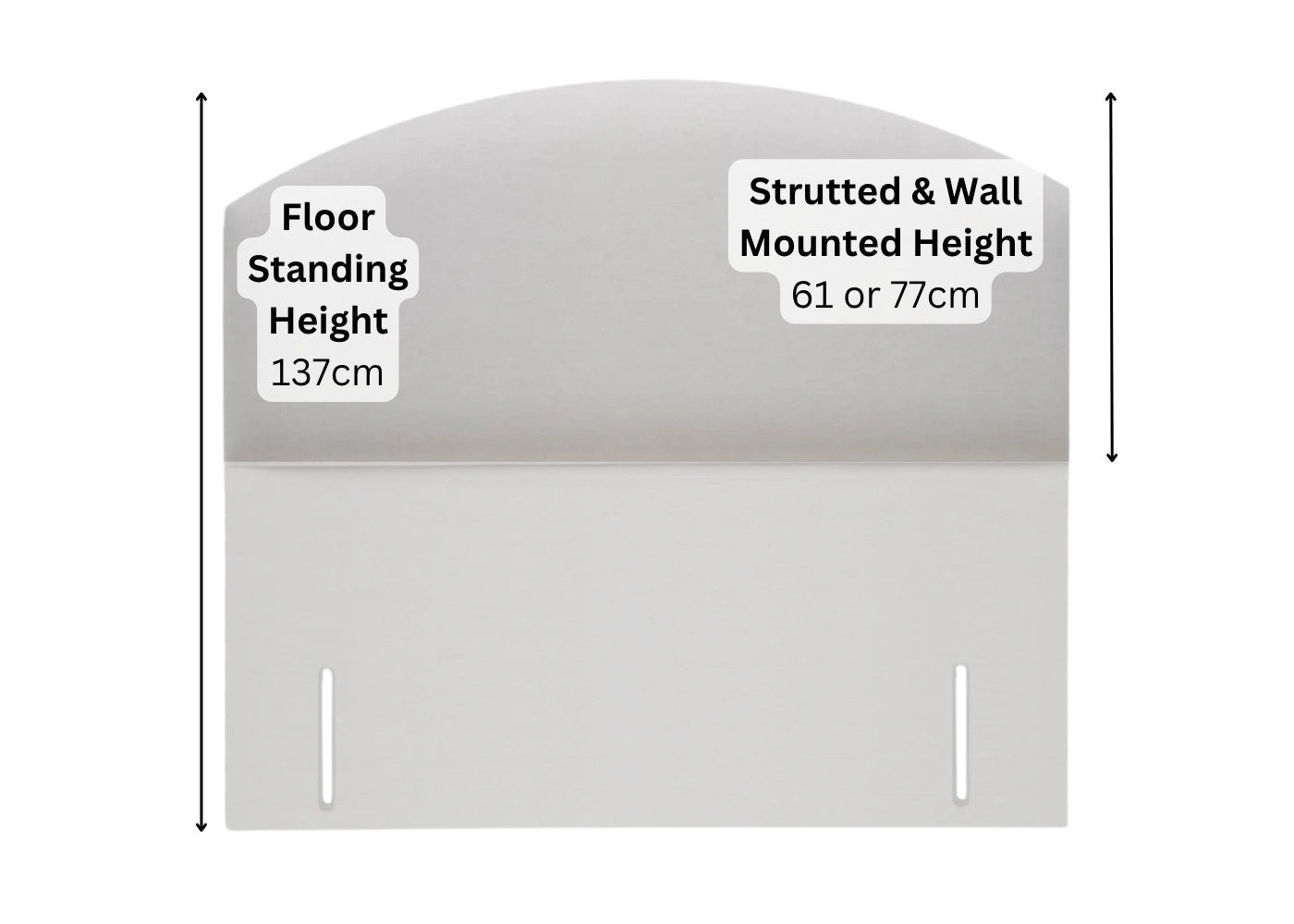 The Fresia Headboard comes in three height options: 61 cm, 71 cm, and 102 cm for strutted or wall-mounted versions, and 132 cm for the floor-standing model. Each includes a 10cm pillowboard for added comfort.