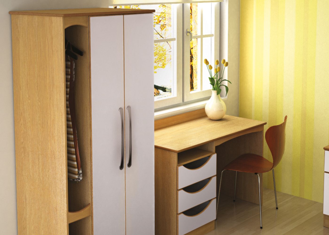 The furniture features curved corners and open handle designs to ease opening drawers. There are open sections of the wardrobe enabling visibility and ease of access.