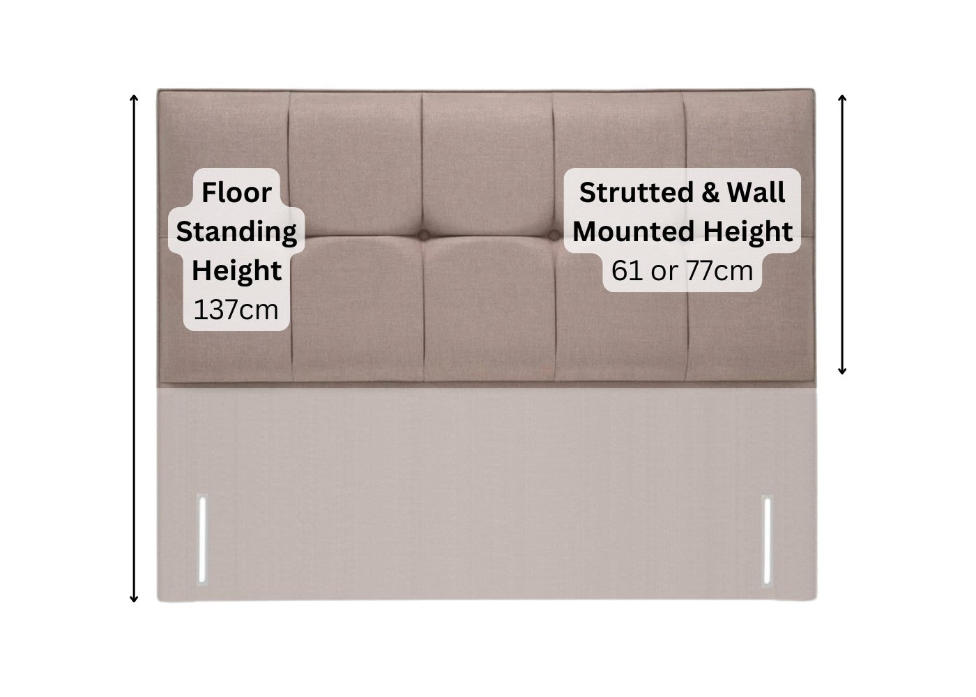 The Ivy Headboard offers three mounting options: strutted, wall-mounted, and floor-standing. Strutted and wall-mounted versions are available in heights of 61 cm, 71 cm, or 102 cm (excluding the 10 cm pillowboard), while the floor-standing model stands at 132 cm.