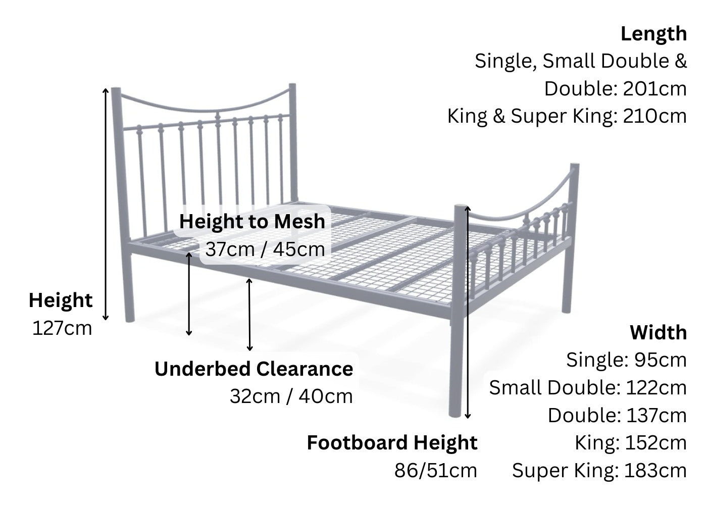 The headboard height is 127 cm, with footboard options at either 86cm (high end) or 47cm (low end). The bed offers underbed clearance options of 32 cm or 40 cm, accommodating various storage needs.