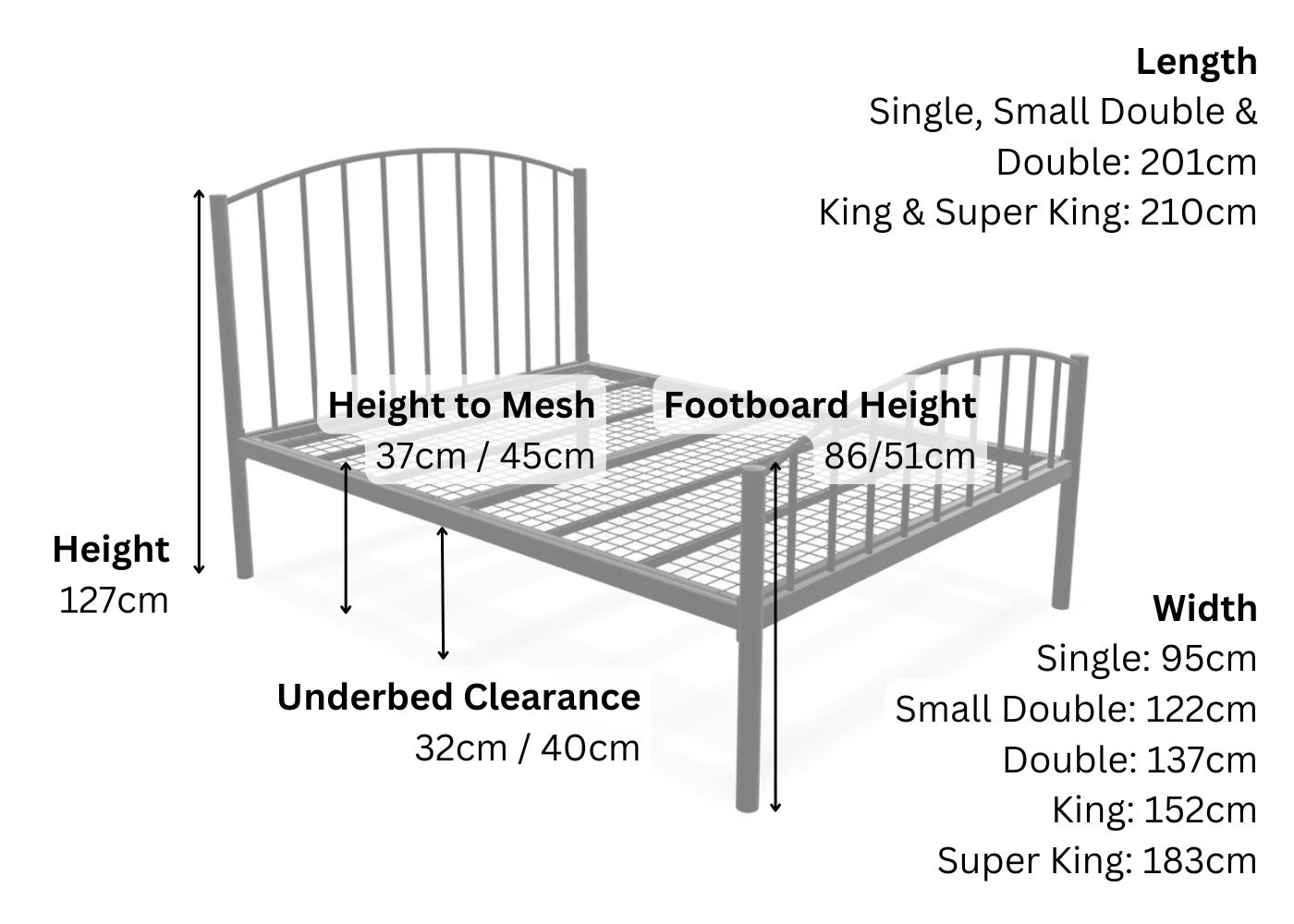 Additional measurements include a headboard height of 127cm, footboard height options of 86cm (high end) or 47cm (low end), and underbed clearance options of 32cm or 40cm.