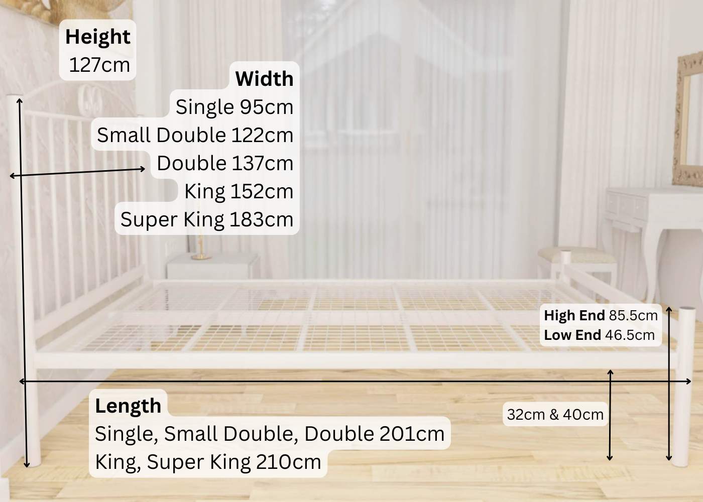 The headboard height is 127 cm, with footboard options at either 86cm (high end) or 47cm (low end).