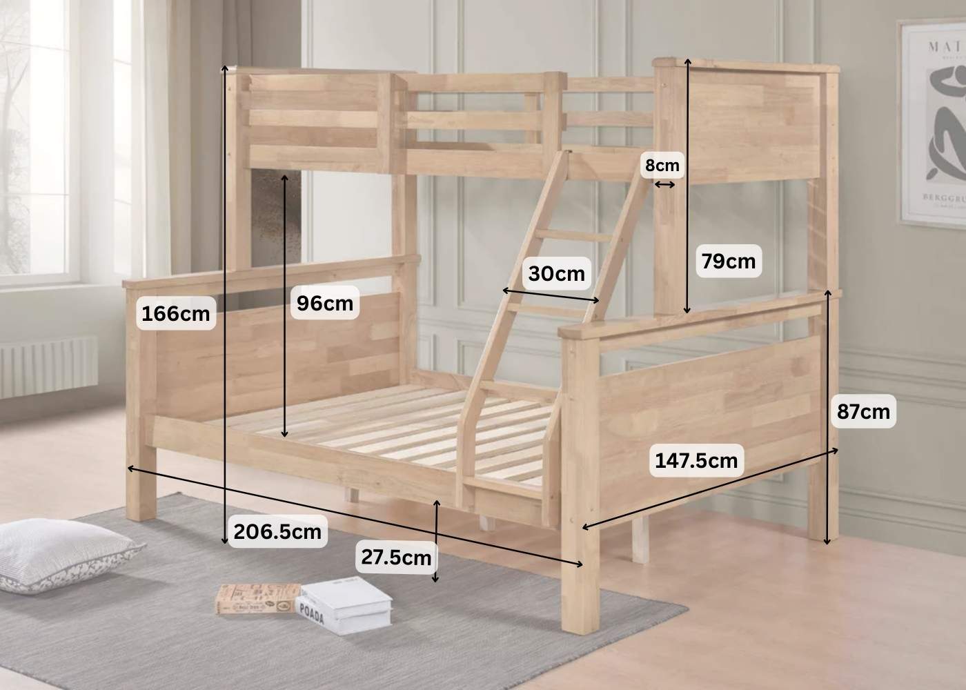 The Langham Triple Bunk Bed is designed to fit a standard UK single mattress (90cm x 190cm) on the top bunk and a standard UK double mattress (135cm x 190cm) on the bottom bunk.
