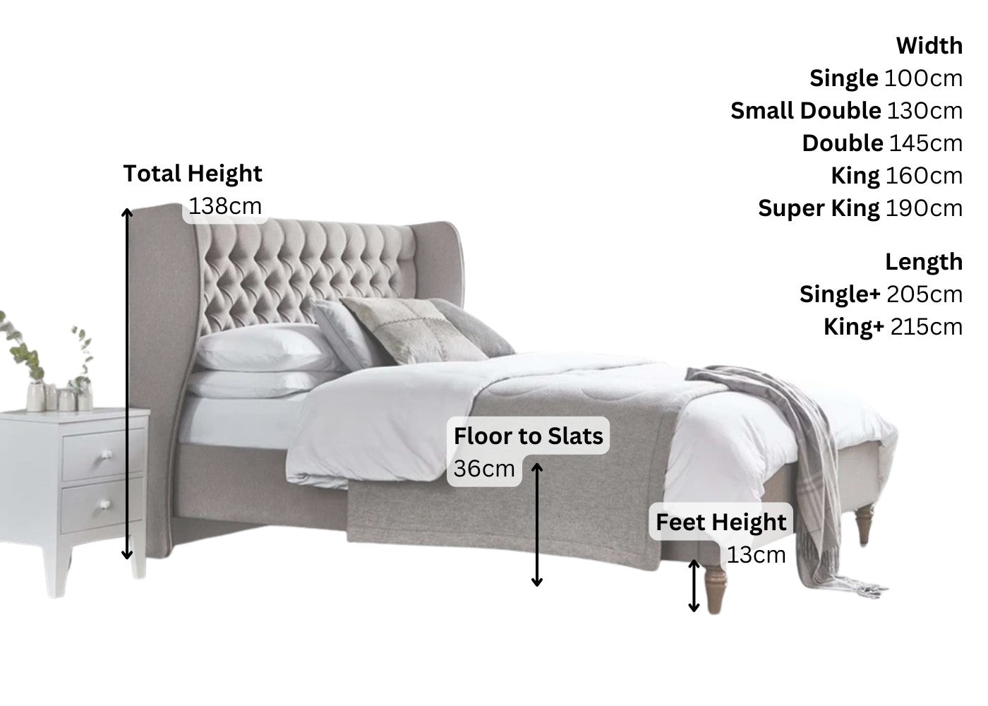 Constructed with solid timber and 25 mm thick slats, it offers durability and stability. The bed features a Chesterfield buttoned headboard, available in squared or curved wingback designs, and is customizable with over 85 fabric options.