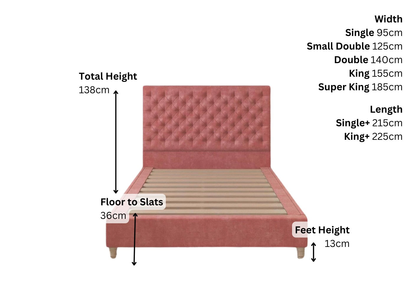 The bed is available in sizes from Single to Super King, with a headboard height of 125 cm, footboard height of 36 cm, and floor to the top of slats measuring 36 cm.