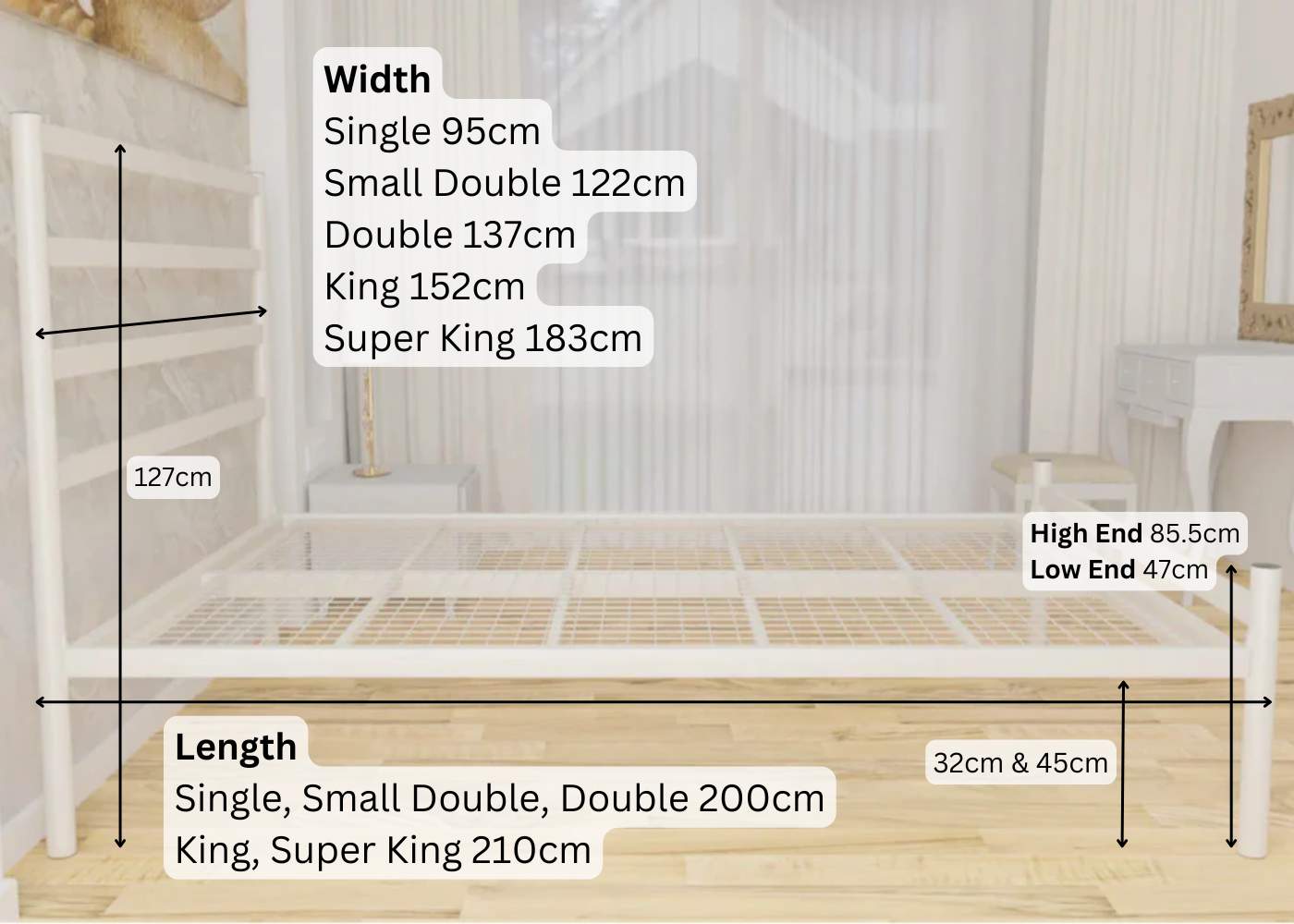 The headboard height is 127cm, with footboard options at either 86cm (high end) or 47cm (low end). The bed offers underbed clearance options of 32 cm or 40 cm, accommodating various storage needs.