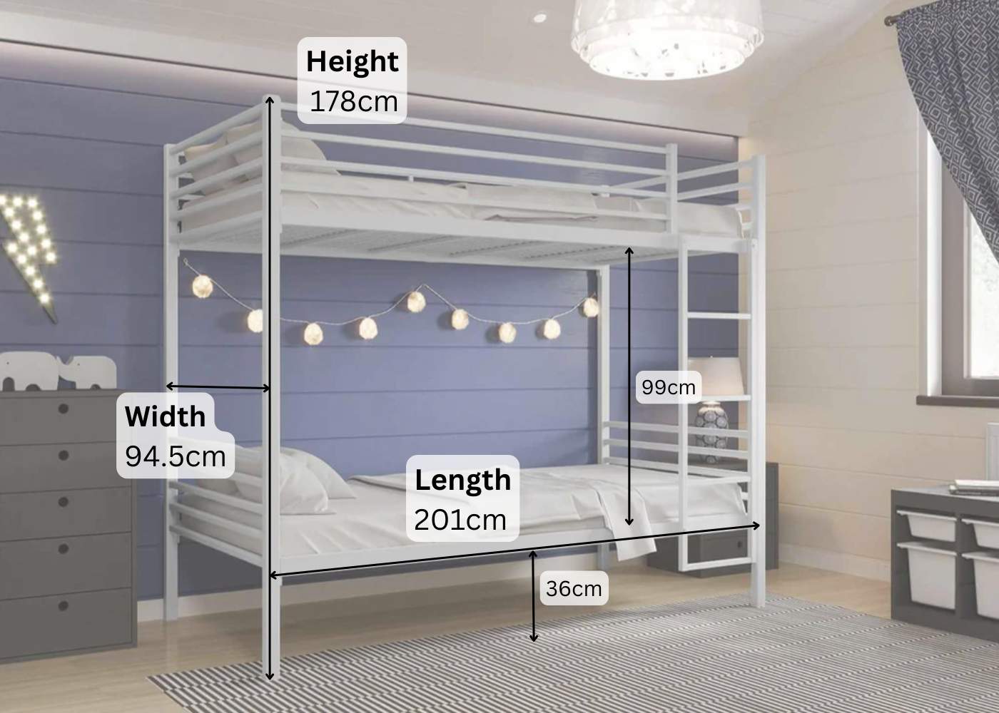 - Do not place a bunk bed near a window or a light fitting.