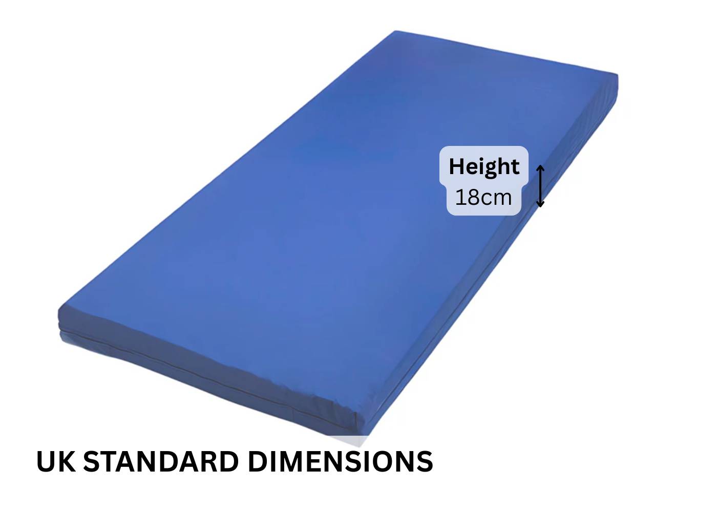 The Heavy Duty Foam Waterproof Mattress is designed for durability and hygiene. It features a 7-inch (18 cm) thick high-grade reflex foam core, providing medium tension support. The mattress is encased in a fully waterproof, wipe-clean cover that is NHS recommended and approved. This cover is hypoallergenic, anti-microbial, and vandal-proof, making it suitable for various environments, including care homes, hotels, and guest houses. Additionally, the mattress is tested to BS7177 ignition source 5 or 7 regulations, ensuring fire safety compliance.