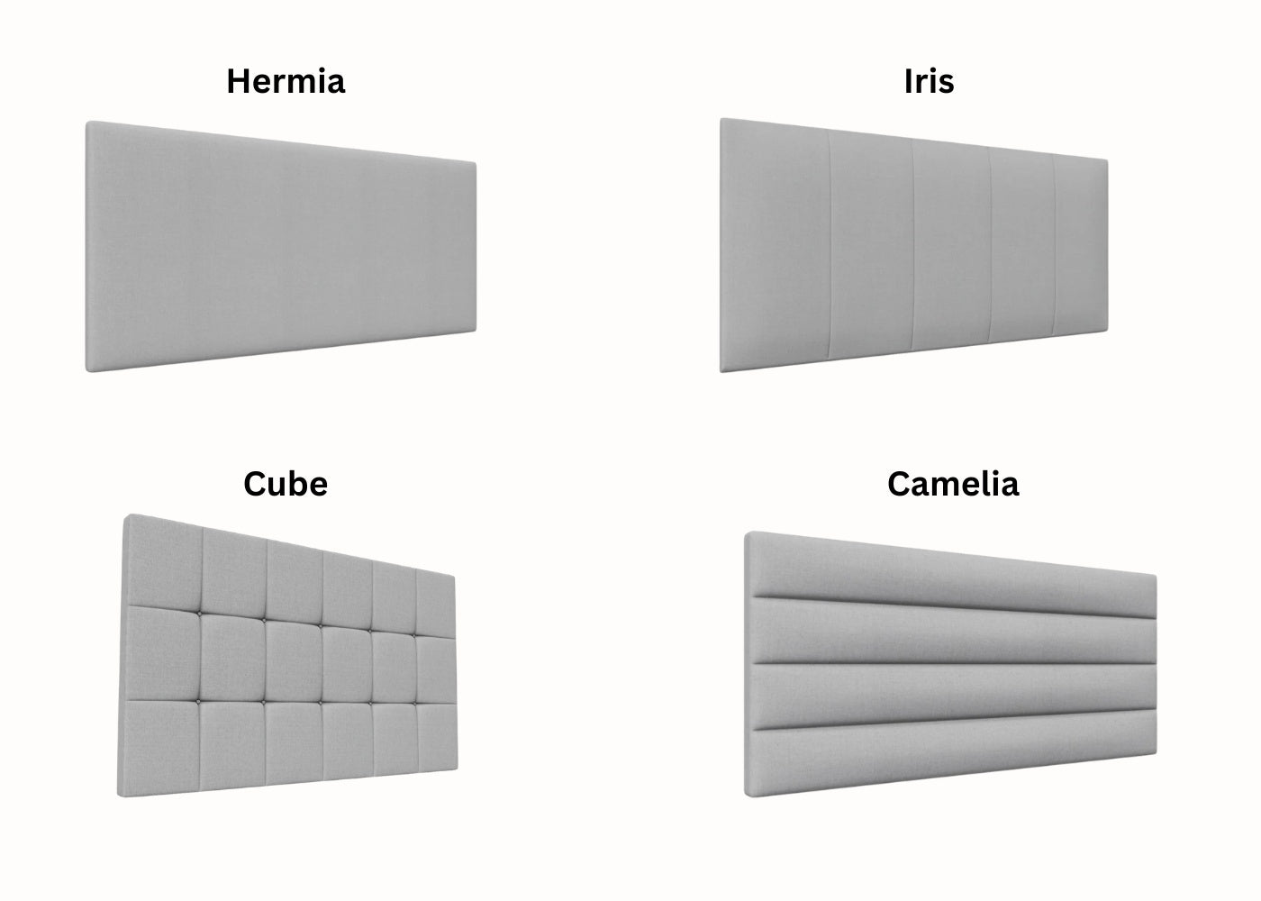 Four light grey fabric headboard styles: Hermia, Iris, Cube, and Camelia.